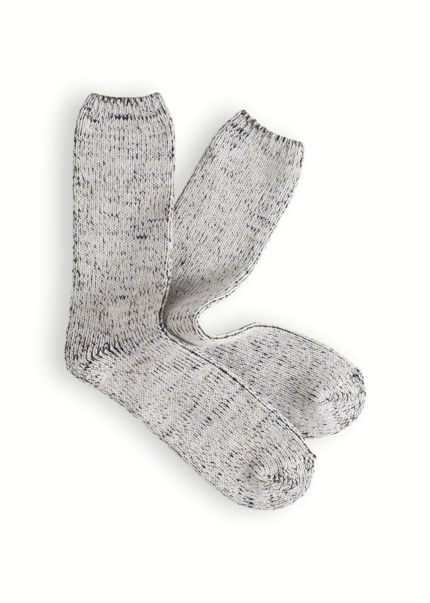 Les chaussettes Thunders Love Wool Collection Recycled Light Grey sont tricotées en laine recyclée grise à l'extérieur, avec des fils blancs et vert foncé plus fins à l'intérieur, révélant un superbe effet à l'extérieur.