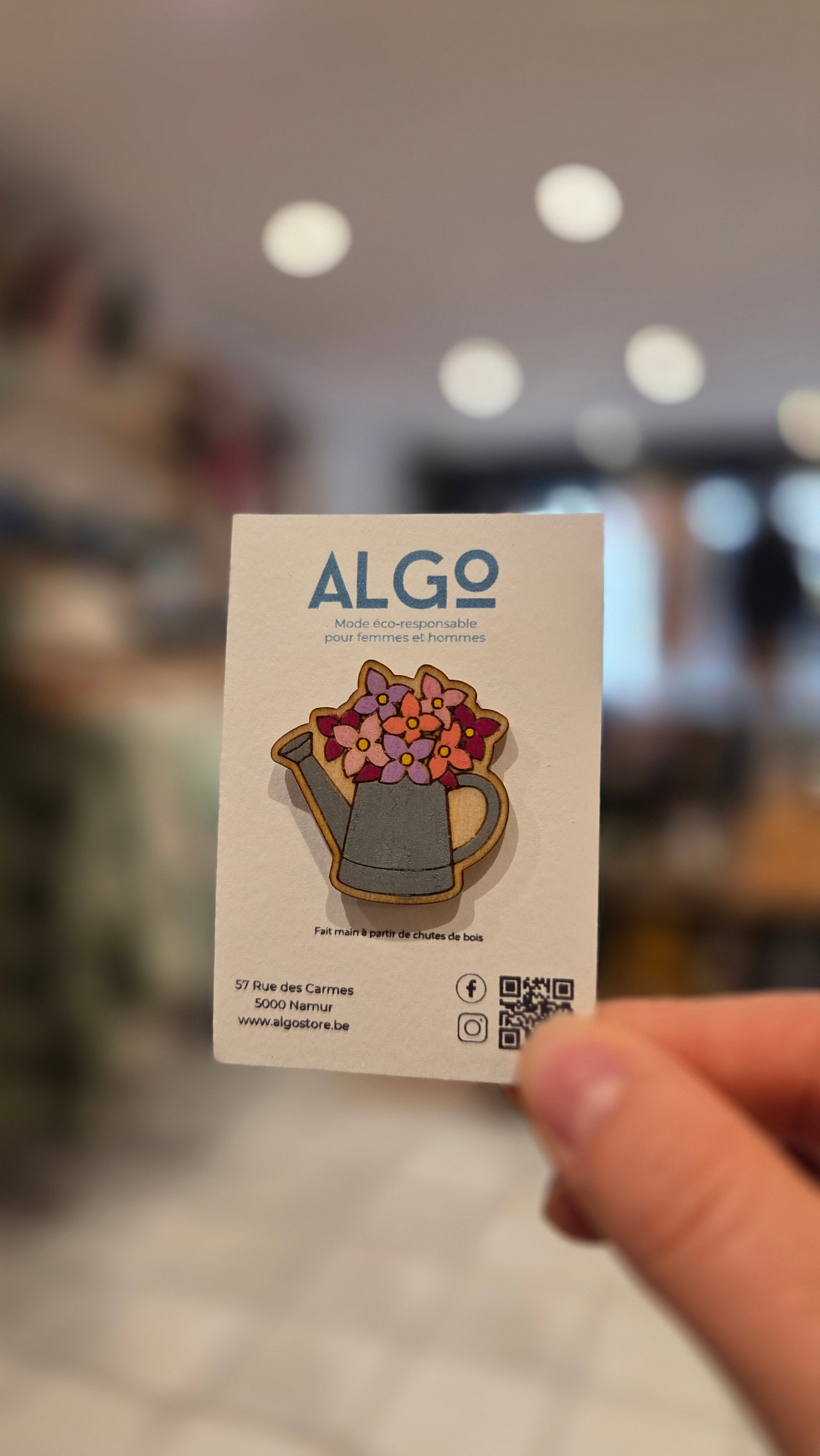 Pin's fabriqué à la main à base de chutes de bois par Louise, la fondatrice d'Algo Store.