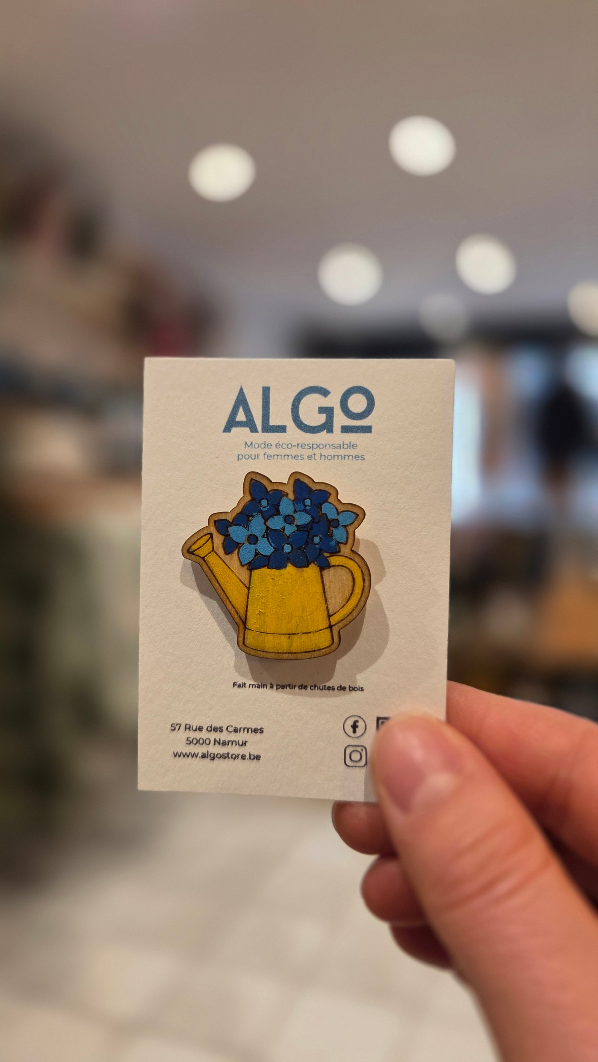 Pin's fabriqué à la main à base de chutes de bois par Louise, la fondatrice d'Algo Store.