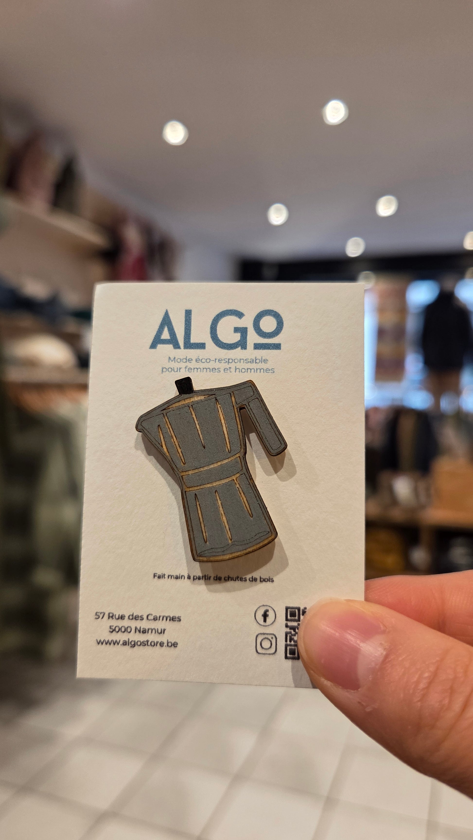 Pin's fabriqué à la main à base de chutes de bois par Louise, la fondatrice d'Algo Store.