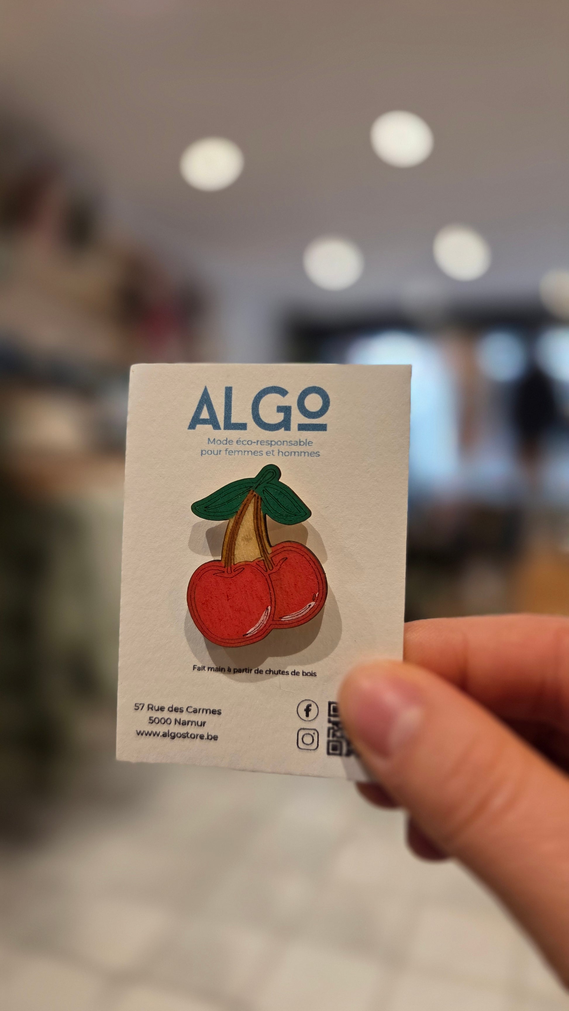 Pin's fabriqué à la main à base de chutes de bois par Louise, la fondatrice d'Algo Store.