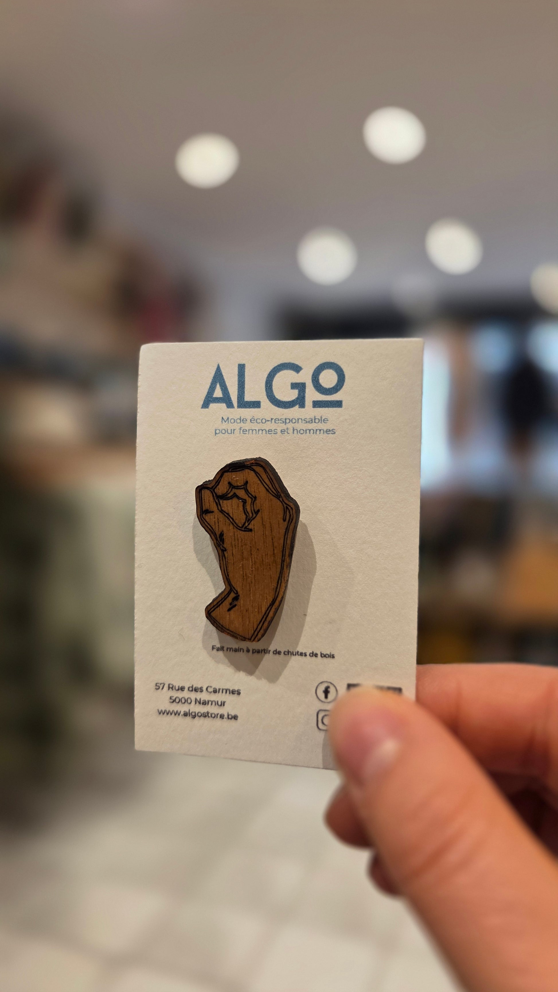 Pin's fabriqué à la main à base de chutes de bois par Louise, la fondatrice d'Algo Store.