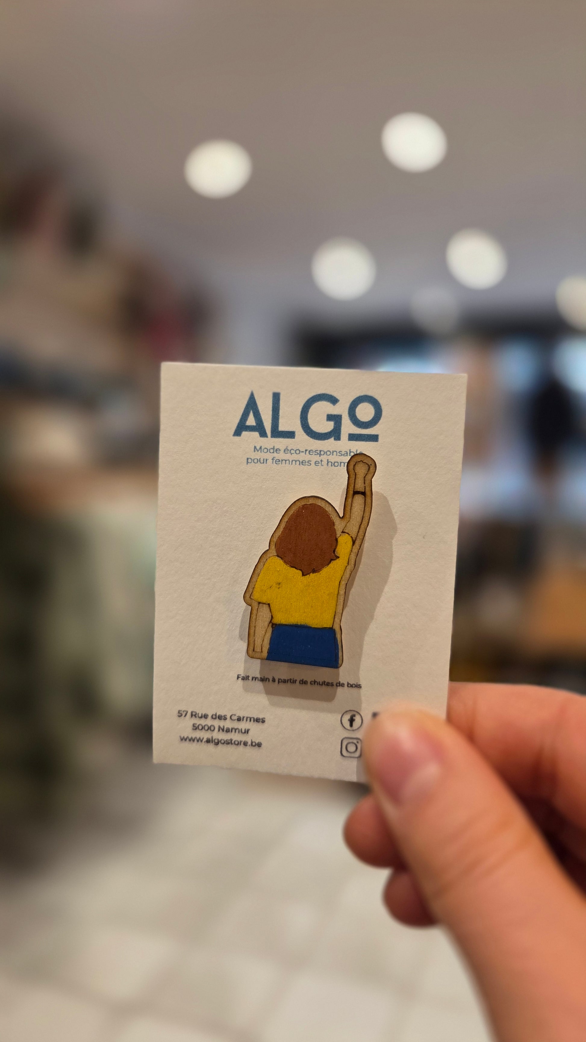 Pin's fabriqué à la main à base de chutes de bois par Louise, la fondatrice d'Algo Store.
