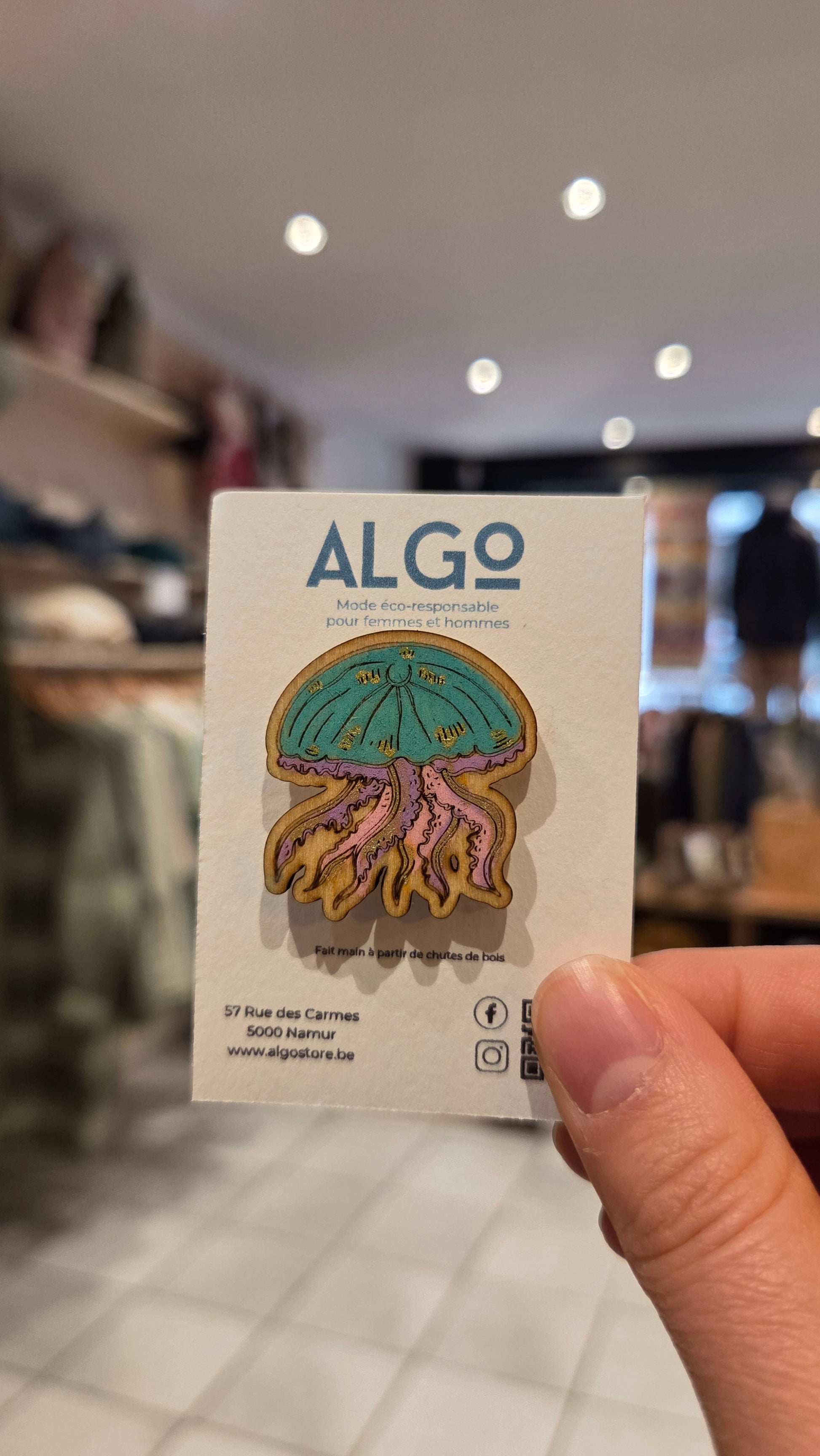 Pin's fabriqué à la main à base de chutes de bois par Louise, la fondatrice d'Algo Store.
