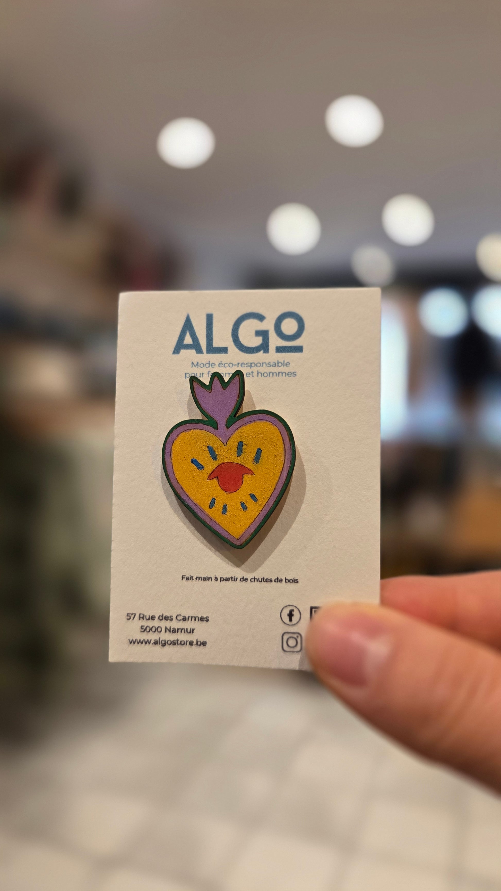Pin's fabriqué à la main à base de chutes de bois par Louise, la fondatrice d'Algo Store.