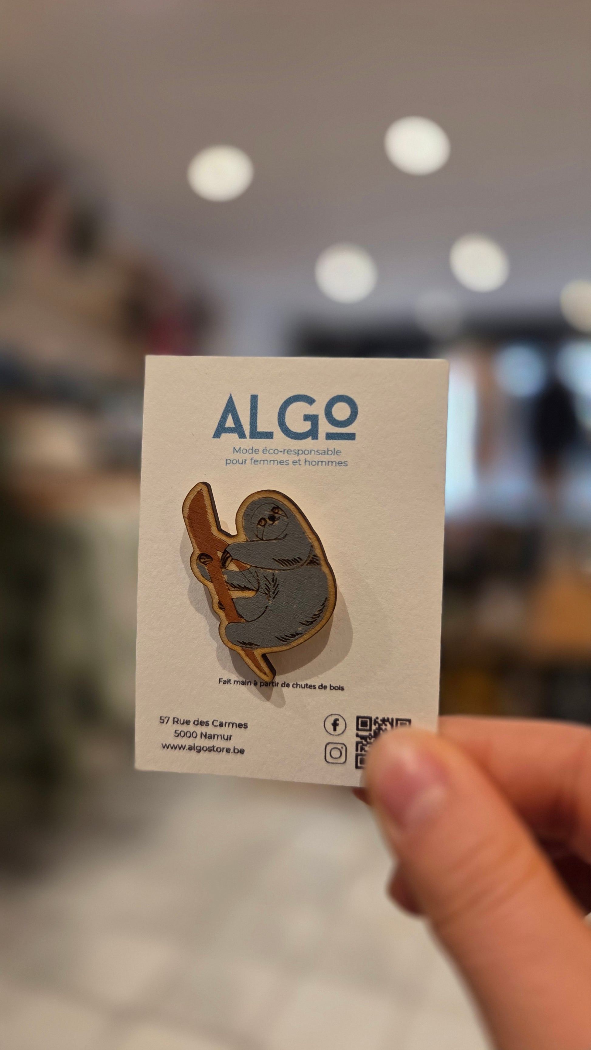 Pin's fabriqué à la main à base de chutes de bois par Louise, la fondatrice d'Algo Store.