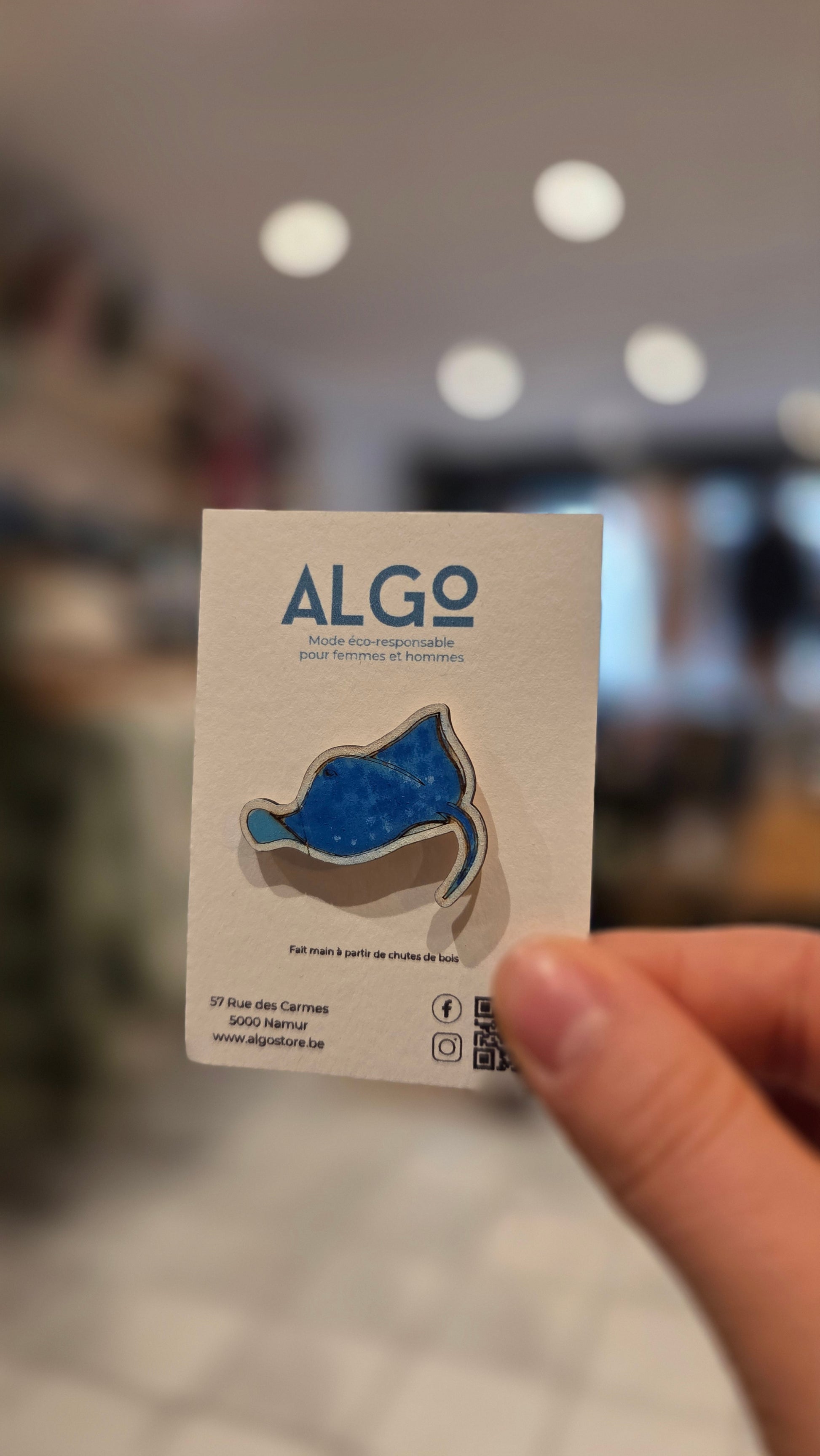 Pin's fabriqué à la main à base de chutes de bois par Louise, la fondatrice d'Algo Store.