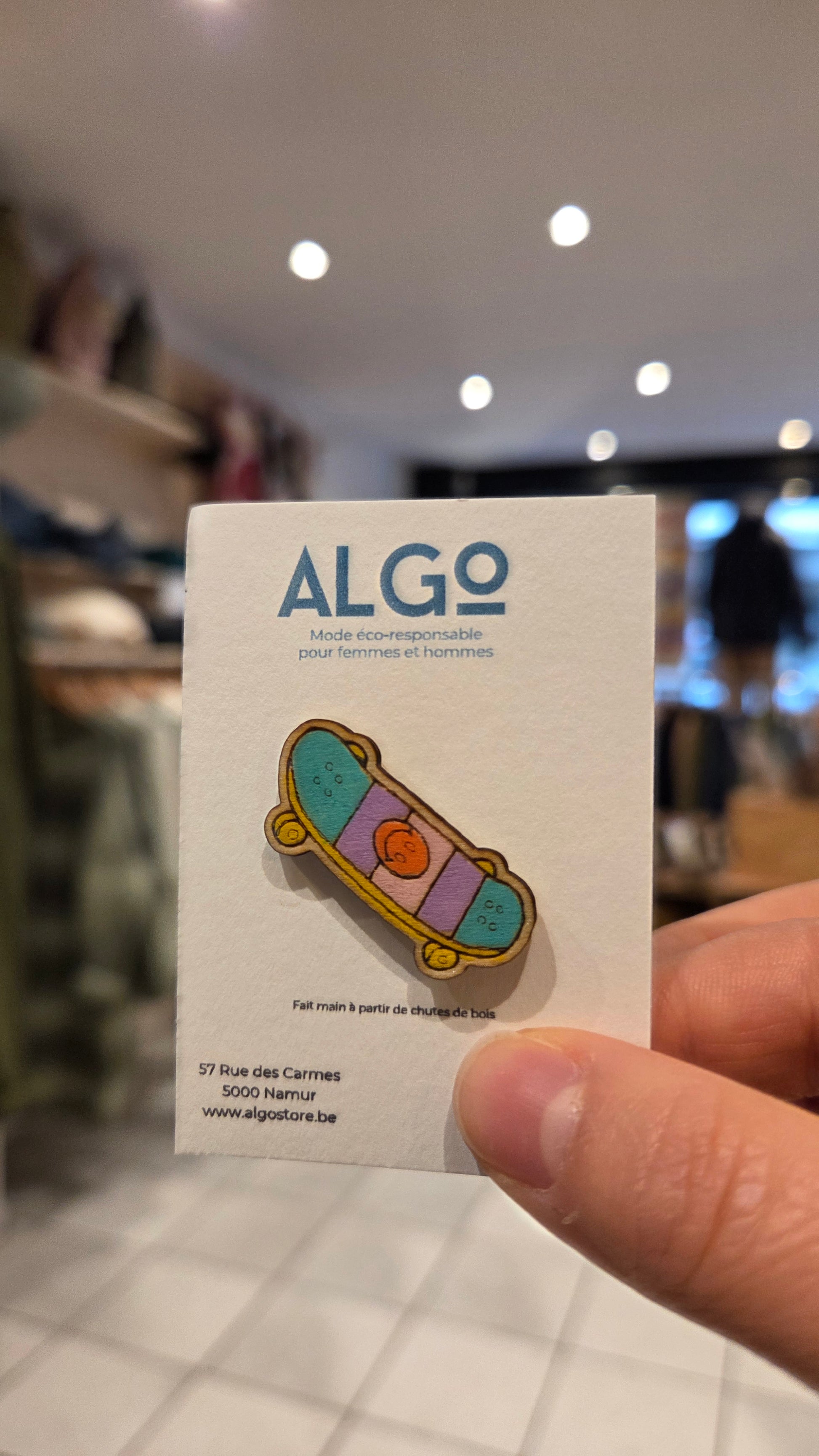 Pin's fabriqué à la main à base de chutes de bois par Louise, la fondatrice d'Algo Store.