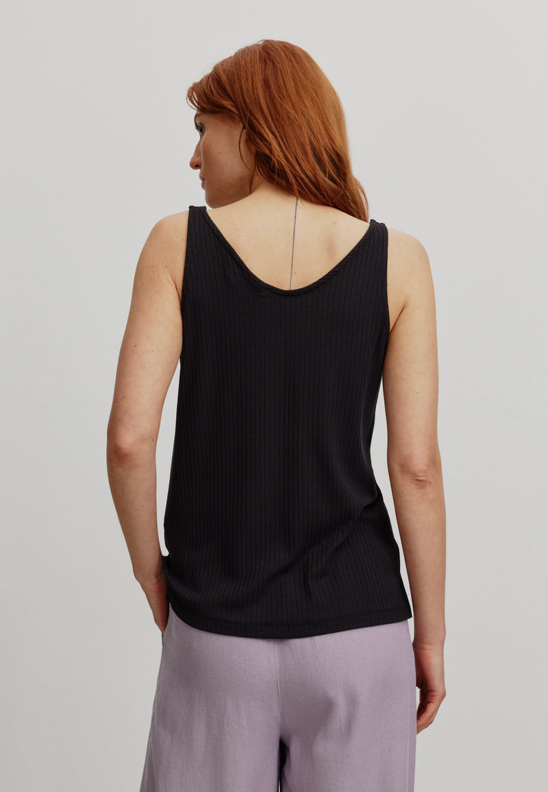 Le top TONINA allie à la perfection élégance et confort. Confectionné dans un mélange LENZING™ ECOVERO™ de haute qualité, il épouse délicatement votre silhouette. Son élégant col en V et ses fines côtes apportent une touche de modernité à ce modèle sans manches.